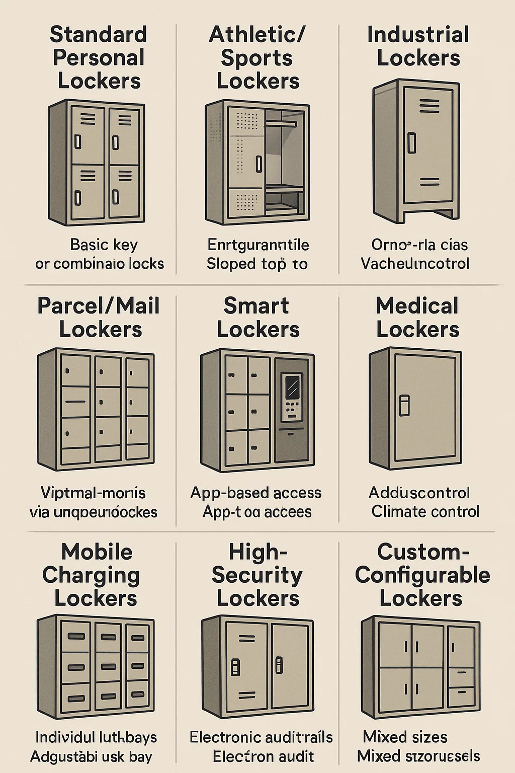 Gli armadietti sono classificati in base al design, alla funzione e al contesto di distribuzione. Di seguito è riportata una ripartizione dei tipi comuni: